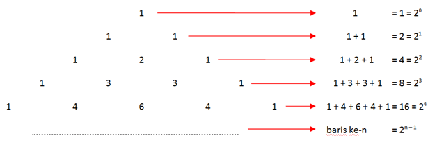 Jadi, dalam pola bilangan segitiga pascal, jumlah bilangan pada baris ke-n = ![]()